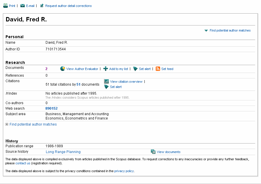 همانطور که شما هم مشاهده میکنید، در میان این متفکران، مایکل پورتر دارای بیشترین تعداد ارجاعات (۵۶۹۴) و همچنین بالاترین h index (23) است. پس از وی نیز، سیدنی وینتر (از نظر تعداد ارجاعات) و جفری ففر (از نظر h index) قرار گرفتهاند. با این وجود، همانگونه که کاملا مشخص است، «فرد آر دیوید»، تنها دارای دو مقاله ثبت شده در پایگاه Scopus میباشد و جالبتر اینکه از سال ۱۹۹۵ به بعد، او حتی یک مقاله علمی نیز منتشر نکرده تا جاییکه حتی برای وی، h index نیز محاسبه نشده است (در تصویر زیر میتوانید اطلاعات ثبت شده در مورد دیوید در پایگاه Scopus را مشاهده کنید). همچنین کل ارجاعات داده شده به این دو مقالة دیوید، ۵۱ مورد میباشد (این تعداد را با ۵۶۹۴ مورد پورتر یا حتی ۴۲۶ مورد کریس آرگریس مقایسه کنید!). بنابراین، آنچه واضح است آن است که در جامعه آکادمیک غرب، دیوید، به هیچ وجه به عنوان یک متفکر شناخته نمیشود.
